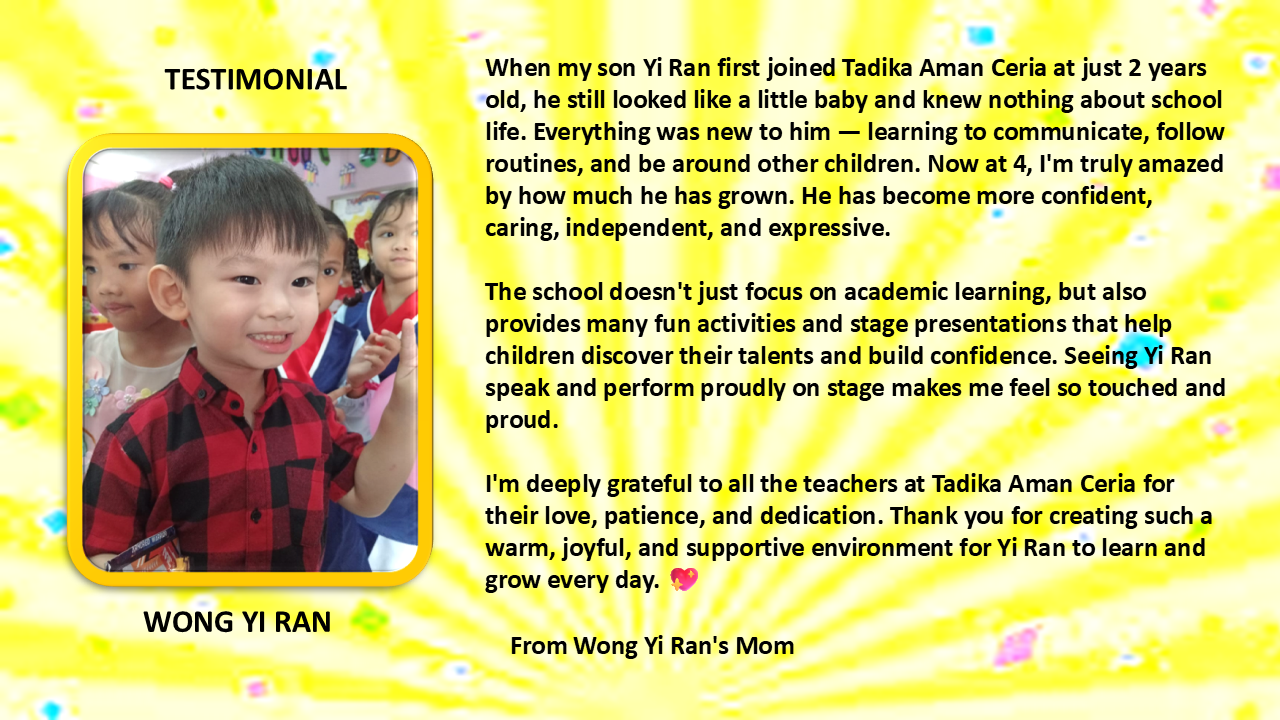 | From Wong Yi Ran'Mom When my son Yi Ran first joined Tadika Aman Ceria at just 2 years old, he still looked like a little baby and knew nothing about school life. Everything was new to him — learning to communicate, follow routines, and be around other children. Now at 4, I'm truly amazed by how much he has grown. He has become more confident, caring, independent, and expressive. The school doesn't just focus on academic learning, but also provides many fun activities and stage presentations that help children discover their talents and build confidence. Seeing Yi Ran speak and perform proudly on stage makes me feel so touched and proud. I'm deeply grateful to all the teachers at Tadika Aman Ceria for their love, patience, and dedication. Thank you for creating such a warm, joyful, and supportive environment for Yi Ran to learn and grow every day. 💖 |