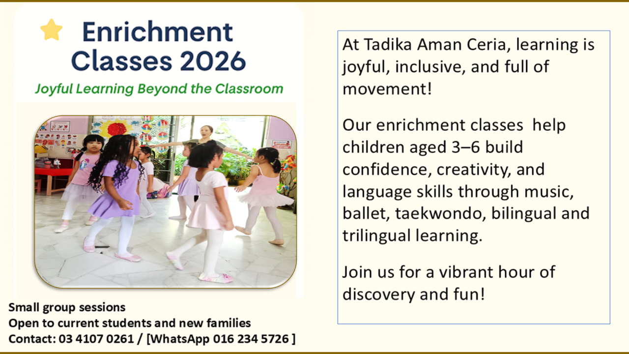 From piano and ballet to Taekwondo and language mastery in English, Bahasa Malaysia, and Mandarin, each session builds confidence, creativity, and lifelong skills.