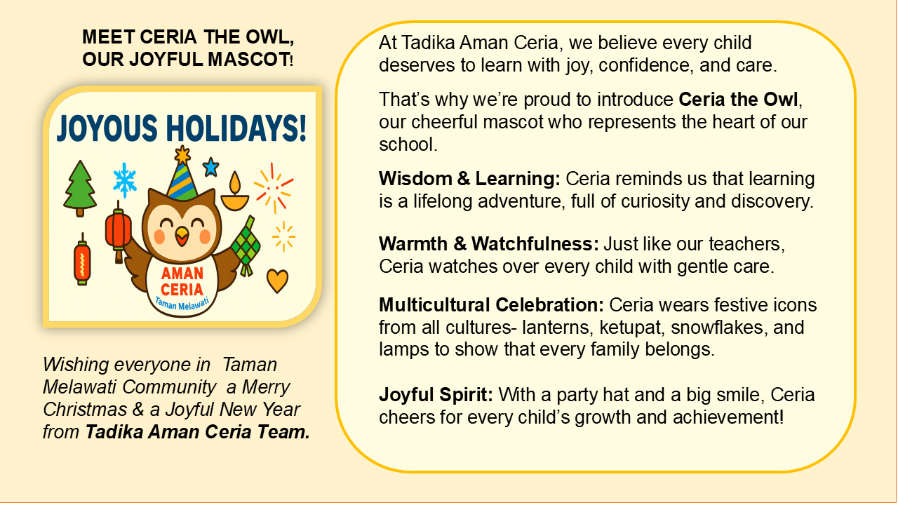 Tadika Aman Ceria & Playschool has been a beacon of joyful, inclusive early childhood education since 1983. Our approach blends academic excellence with emotional and social development, creating a nurturing space where children thrive through play, exploration, and multilingual engagement