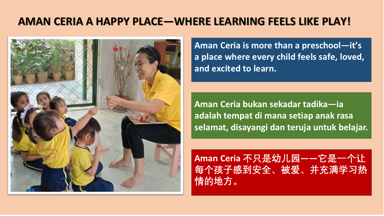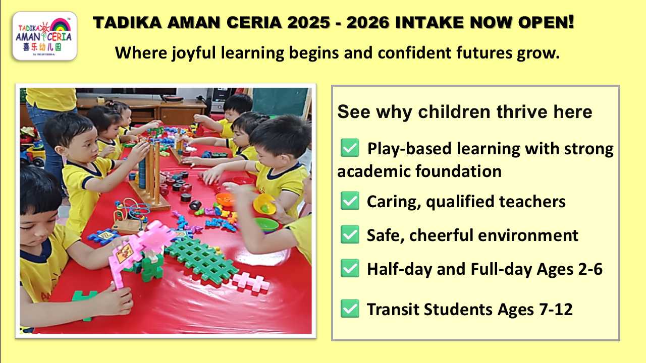 Welcome to Tadika Aman Ceria and Playschool long-standing commitment to quality early childhood education since 1983. We prepare preschoolers for the future—critical thinking, problem-solving, decision-making, collaboration, communication, and a growth mindset.