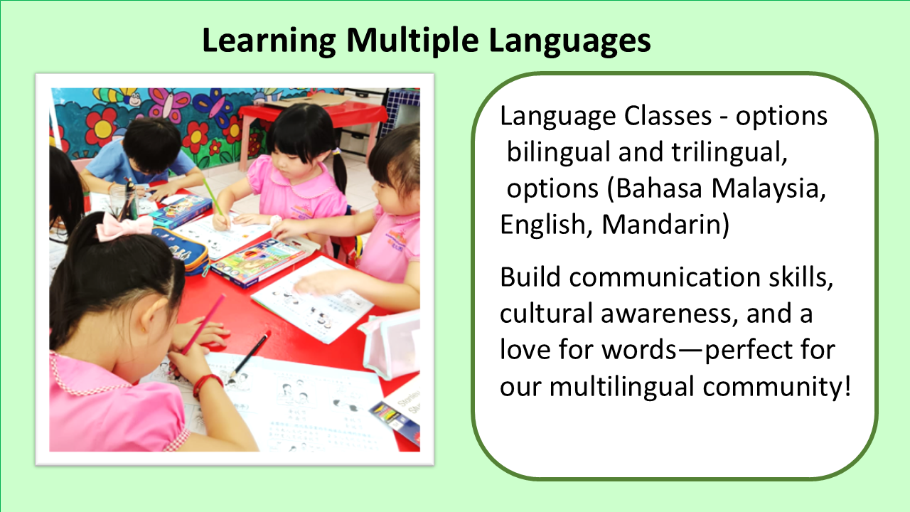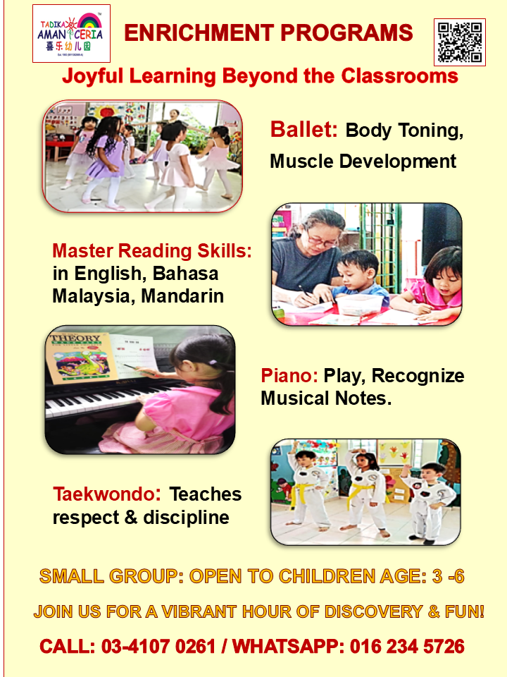 From piano and ballet to Taekwondo and language mastery in English, Bahasa Malaysia, and Mandarin, each session builds confidence, creativity, and lifelong skills.