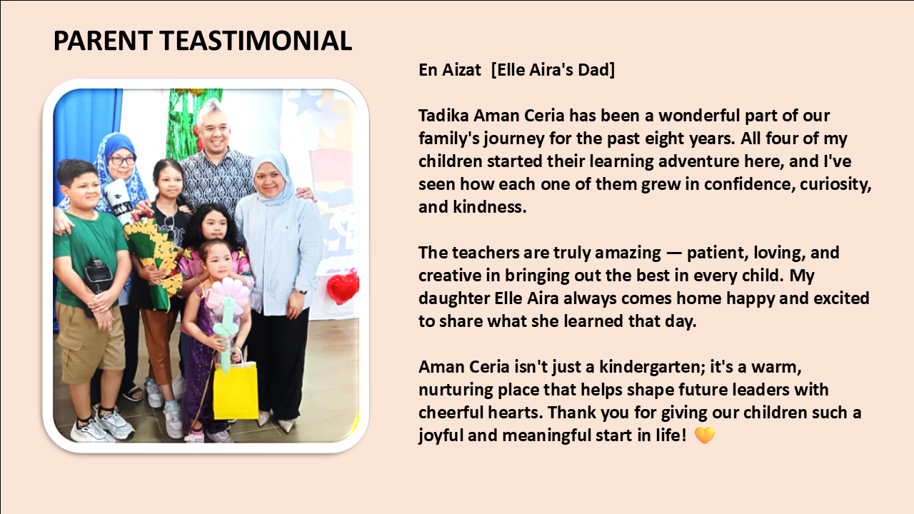 Our minds are at peace knowing that our children are in very good hands. We would like to take this opportunity to thank Tadika Aman Ceria, all the teachers, the parents and children for contributing to the positive and healthy growth and development of my children's life. Thank you and God bless you.