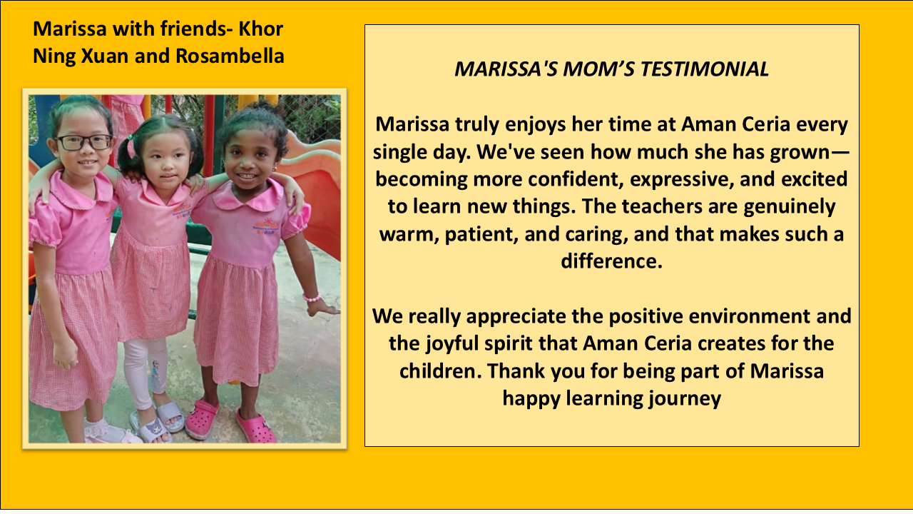 Marissa truly enjoys her time at Aman Ceria every single day. We've seen how much she has grown—becoming more confident, expressive, and excited to learn new things. The teachers are genuinely warm, patient, and caring, and that makes such a difference.